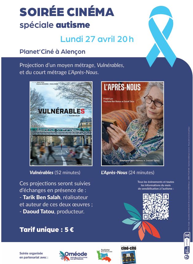 Ornéode, en partenariat avec l’association Autisme Basse Normandie et l’association Ciné-Cité Alençon, vous invite à une soirée cinéma engagée et émouvante, autour de deux courts-métrages du réalisateur Tarik Ben Salah, qui sera présent pour échanger avec le public et de Daoud Tatou, Directeur de l’association Le Silence des Justes.